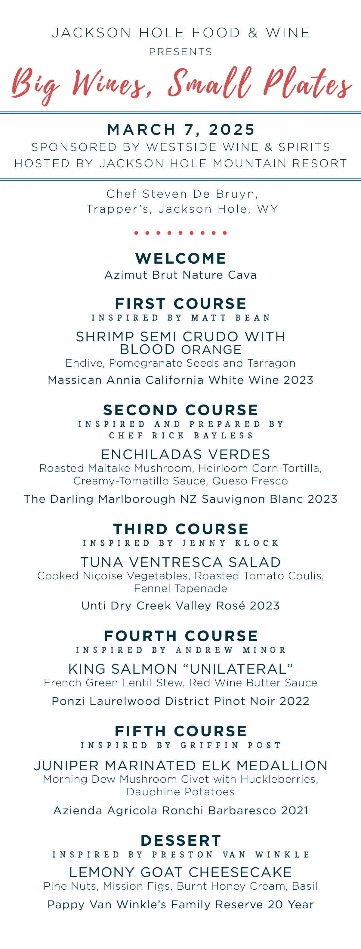 We welcomed a star-studded roster of culinary and beverage experts including guest chef Rick Bayless and team of Frontera Restaurant Group of Chicago, IL; local chef Steven De Bruyn of Jackson Hole Mountain Resort; Andrew Minor of VINTUS Wines; Master of Ceremonies Matt Bean; Preston Van Winkle of Old Rip Van Winkle and featured spirits Wyoming Whiskey.